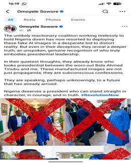 In their quietest thoughts, they already know who looks presidential between the worn-out Bola Ahmed Tinubu and me. These manufactured images are not just propaganda; they are subconscious confessions. They are speaking, perhaps unknowingly, to a future that has already arrived. Nigeria deserves a president who can stand straight in character, in courage, and in truth. #RevolutionNow”