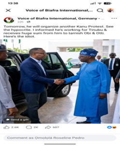 Facebook page, Voice of Biafra Internationally, Germany posted the photo with a caption that reads, “Tomorrow, he will organise another Kanu protest. See the hypocrite. I informed he’s working for Tinunu & receives a huge sum from him to tarnish Obi and Otti. here’s the idiot”
