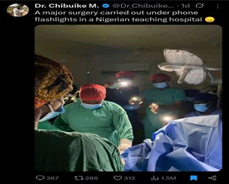 On the 25th of March 2026, X user @Dr_Chibuike_M posted the photo on his page with the caption “A major surgery carried out under phone flashlights in a Nigerian teaching hospital”. His post has since generated 1.5 million views, 310 likes, and 286 shares.
