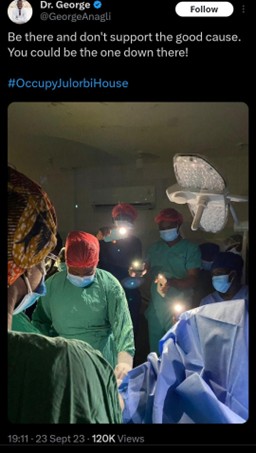 On the 23rd of September 2023, Ghanaian X user @GeorgeAnagli posted the photo with a text that reads, “Be there and don’t support the good cause.” You could be the one down there! #OccupyJulorbiHouse” On the same date, another Ghanaian X user, @Jeremyb_, posted the photo with the caption “THIS IS WHY WE PROTEST #OccupyJulorbiHouse”