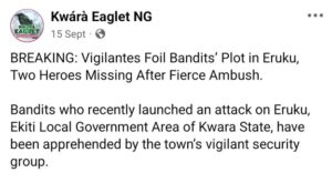 It will be recalled that some days ago, there was a bandit attack invading a church in the Eruku community in the Ekiti Local Government Area of Kwara State, where two people were killed, and others abducted while having a night programme.