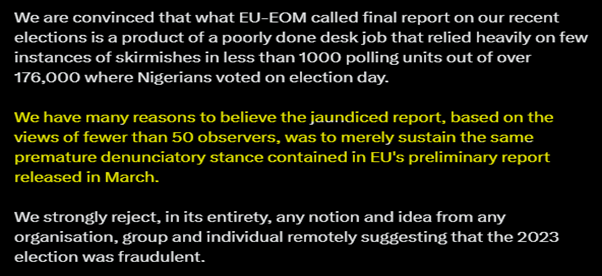 vii. Also, a quick check through the news stories and editorials (like this, this and this) on the final EU EOM report shows that the mission is acknowledged as well staffed. A vanguard article titled “Much ado about EU-EOM report” noted that “the EU-EOM was definitely the largest of all the missions (both local and foreign) that observed and published their findings of the 2023 general elections”.