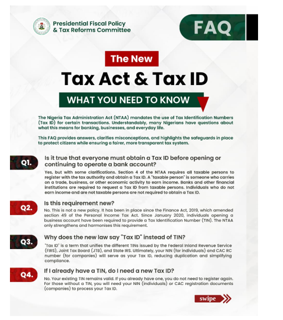 CLAIM: Nigerians will not be able to operate bank accounts without a Tax ID. VERDICT: Misleading. The new policy is binding on Nigerians of taxable status only. FULL STORY A claim has been shared on social media stating that starting in January 2026, Nigerians—both residents and non-residents—will need a tax identification (Tax ID) number to