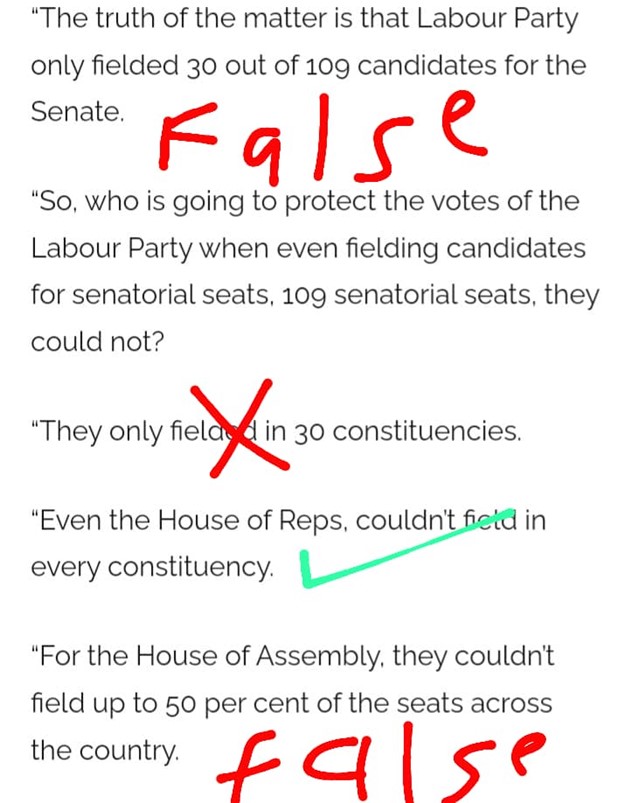 - Claim 3: That Labour Party couldn’t field up to 50 per cent of the seats across the country for the Houses of Assembly election.