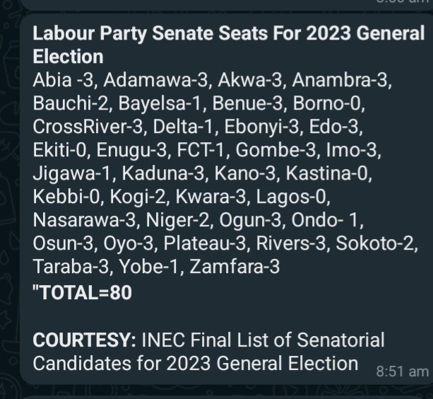 Since the INEC list of candidates were collated and published state by state across all the political parties, we resorted to manual counting of the list of senatorial candidates fielded by the Labour Party and came to a conclusion.