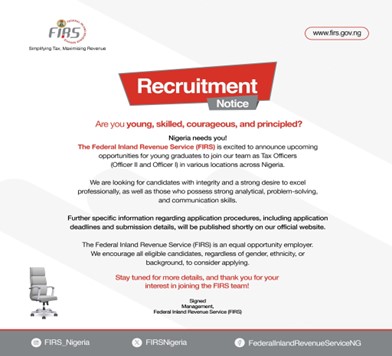 On October 21, 2024, the Daily Post reported that the Federal Inland Revenue Service, or FIRS, is currently recruiting young graduates to join its team as Tax Officers (Officer Il and Officer I).