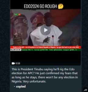 Similarly, the video was also broadcast on WhatsApp with a caption that insinuated that President Tinubu has already aired his intention to rig the forthcoming off-cycle governorship election in September for his party, adding that the outcome of the poll has already been determined before the activity.
