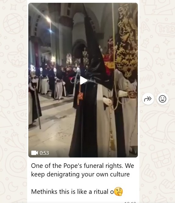 Apart from WhatsApp, the video has also been circulated on other media platforms as seen here, here and here with a similar indication that the burial ceremony of the Catholic Pope is done in an occultic style.