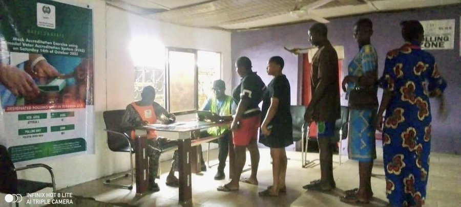 Similar mock accreditation exercise took place randomly in selected polling units in Bayelsa state. In the one monitored at Peletia Town Hall, Yenagoa, Local Government Area, registered voters could be seen queuing up for accreditation.
