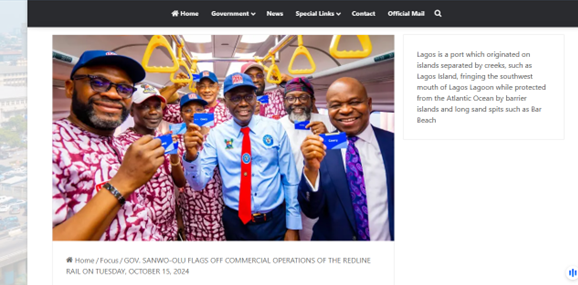 According to the website, the original photograph of the image features the “Governor of Lagos State, Mr. Babajide Sanwo-Olu (third right); Managing Director of LAMATA, Engr. (Mrs) Abimbola Akinajo (third left); Special Adviser to the Governor on Transportation, Hon. Sola Giwa (second left); Permanent Secretary, Ministry of Transportation, Mr. Olawale Musa (left) and others during the flag off of commercial operations of the Redline rail at the Oyingbo Terminal on Tuesday, 15 October 2024.”
