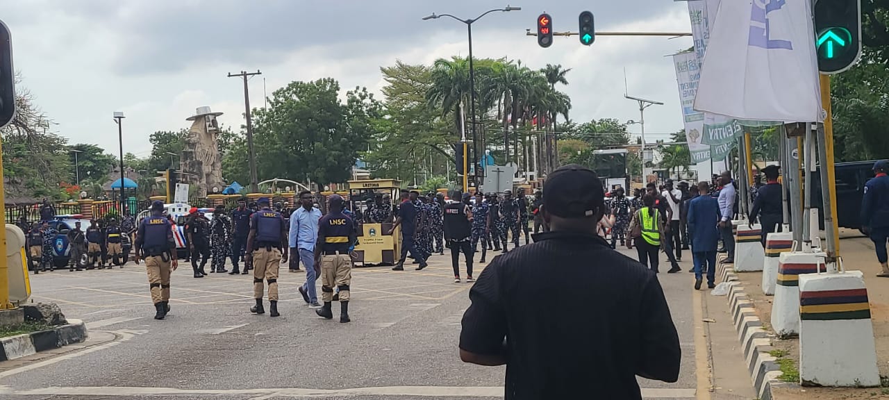 In Lagos, the demonstration began at the Ikeja underbridge under the watch of the heavy presence of security agencies, including the police, the Nigeria Security & Civil Defence Corps and the Lagos State Neighbourhood Safety Agency, who followed the protesters to the State House of Assembly, which was locked.