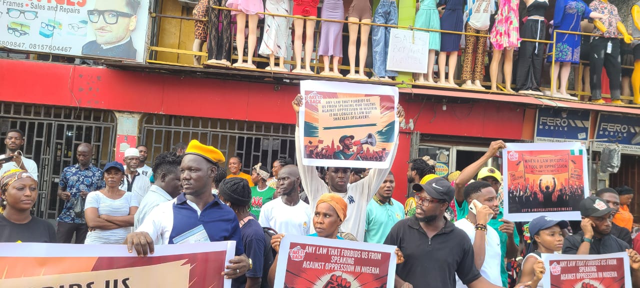 The protesters were seen carrying banners and placards with different inscriptions like “Any law that forbids us from speaking our truths against oppression in Nigeria is no longer a law but a shackle of slavery” and “When a law becomes a tool of oppression, the citizens must unite to repeal it,” among others.