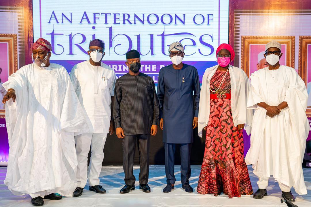 Vice President Yemi Osinbajo, Governor Babajide Sanwo-Olu of Lagos State and Governor Kayode Fayemi of Ekiti State who is also the Chairman of Nigeria Governors’ Forum led an array of dignitaries to the event christened: ‘An Afternoon of Tributes Honouring the Departed, Inspiring the Living.’