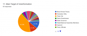- Peter Obi was mostly at the centre of false information (41.3%) followed by Atiku Abubakar and Bola Ahmed Tinubu each at (11.1%).
