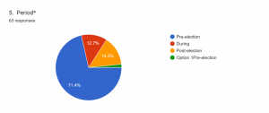 A greater percentage of false information occurred in the period before the general elections (71.4%), followed by a little more after the election (14.3%) and very few during the election (12.7%).