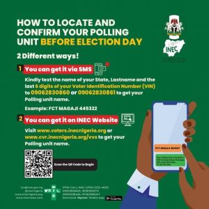 “Furthermore, the Commission is offering two unique ways by which all voters can locate and confirm their Polling Units before Election Day. This can be done by sending a normal text message or by simply visiting our website. The detailed procedure is attached to this message and also uploaded to our website and social media platforms. You can also send Inquiries to our various public outreach platforms shown in the attached procedure.